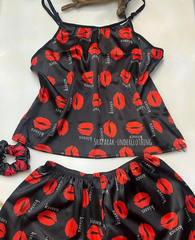 لباس خواب زنانه ساتن طرح لب مشکی